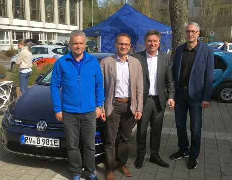 Für alle Gemeinden des Verwaltungsverbandes Gullen wurden Förderungen für die Teilumstellung des kommunalen Fuhrparks beantragt und auch bewilligt. Unter dem Förderkennzeichen 03K02657M1 ist diese Maßnahme in der Gemeinde Bodnegg bereits umgesetzt: Die Gemeinde freut sich über einen neuen VW e-Golf als Dienstwagen, der über eine eigene Wallbox am Rathaus mit Ökostrom versorgt wird (Bild 1) und der Hausmeister ist mit einem e-Lastenrad elektrisch mobil unterwegs. Die vom Fördergeldgeber mit 50% geförderten Investitionen wurden am 14.04.18 im Rahmen des großen Mobilitäts-Erlebnistages den zahlreichen Bürgern und Ehrengästen präsentiert. Darunter auch Herr Minister Manfred Lucha, der sichtlich beeindruckt und erfreut war (Bild 2), wie innovativ eine kleine Gemeinde im ländlichen Raum unterwegs ist, dass Besucher aus dem ganzen Vierländereck im Rahmen der internationalen E-Auto-Sternfahrt mit ihren Elektrofahrzeugen emissionsfrei anreisten und wie groß das Interesse der Bürger (über 100 Probefahrten!) an nachhaltiger Mobilität ist.